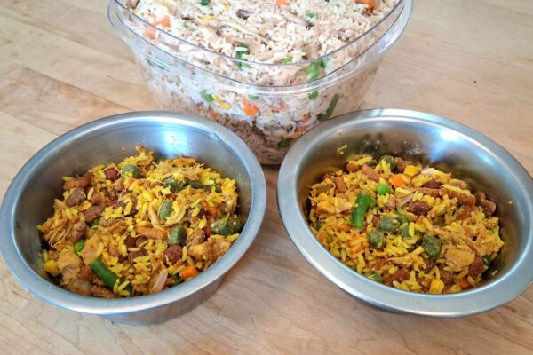 Raw chicken, parboiled rice, and frozen mixed vegetables—fresh ingredients coming together for a nutritious homemade dog food recipe.